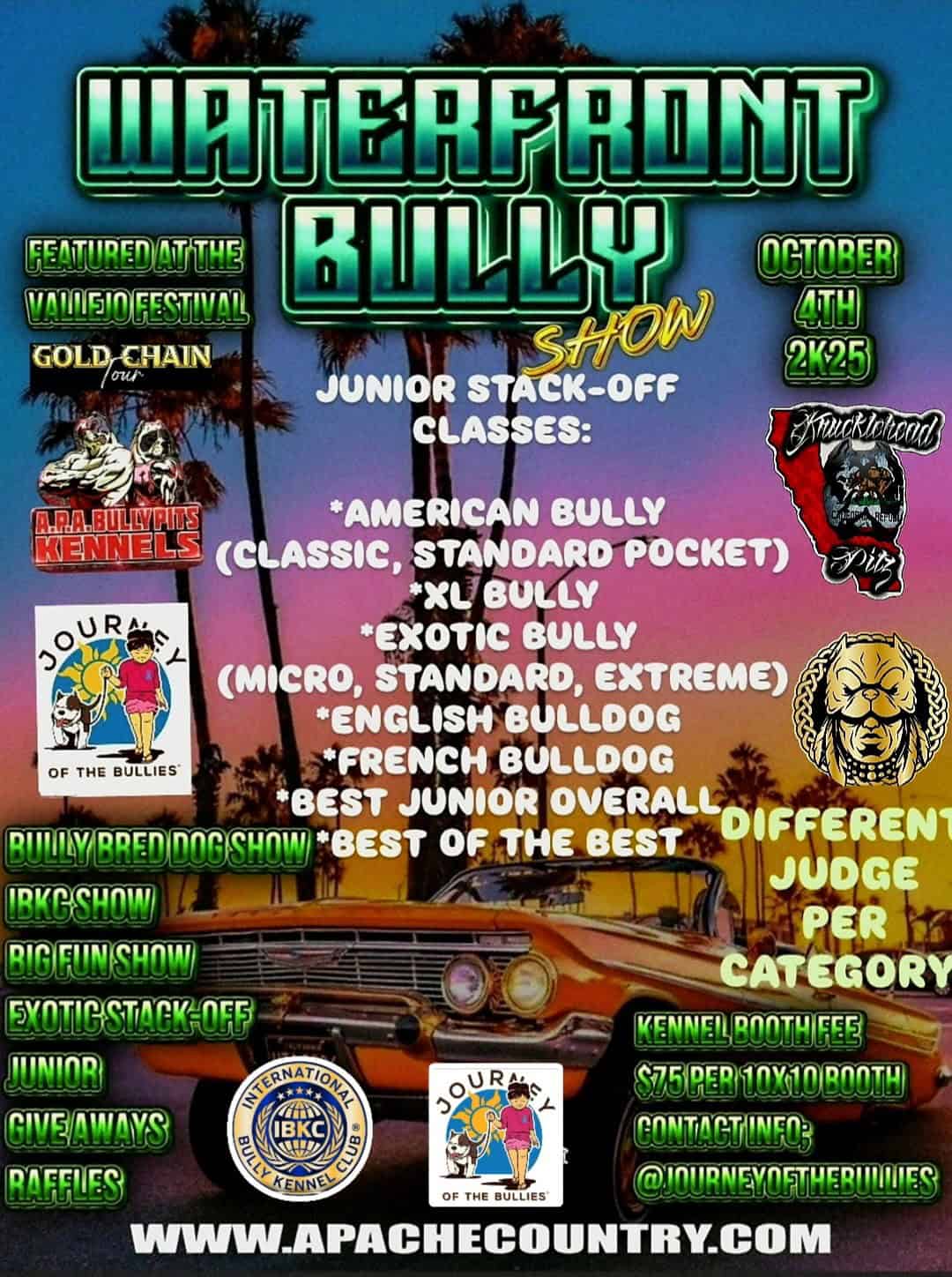 Waterfront Bully Show Organized by Journey of the Bullies Hosted by Apache Country & The International Bully Kennel Club. This special feature includes an official sanctioned Bully Dog Show, a Junior Handler Seminar for the kids that are just getting started or those who need to brush up on their show and breed knowledge. Also, a Fun Show Stack Off competition and #goldchaintour Best of the Best award. Participants will join this show from all over the bay area and California as far as Los Angeles. The pacific northwest may as well be in attendance traveling to Vallejo.