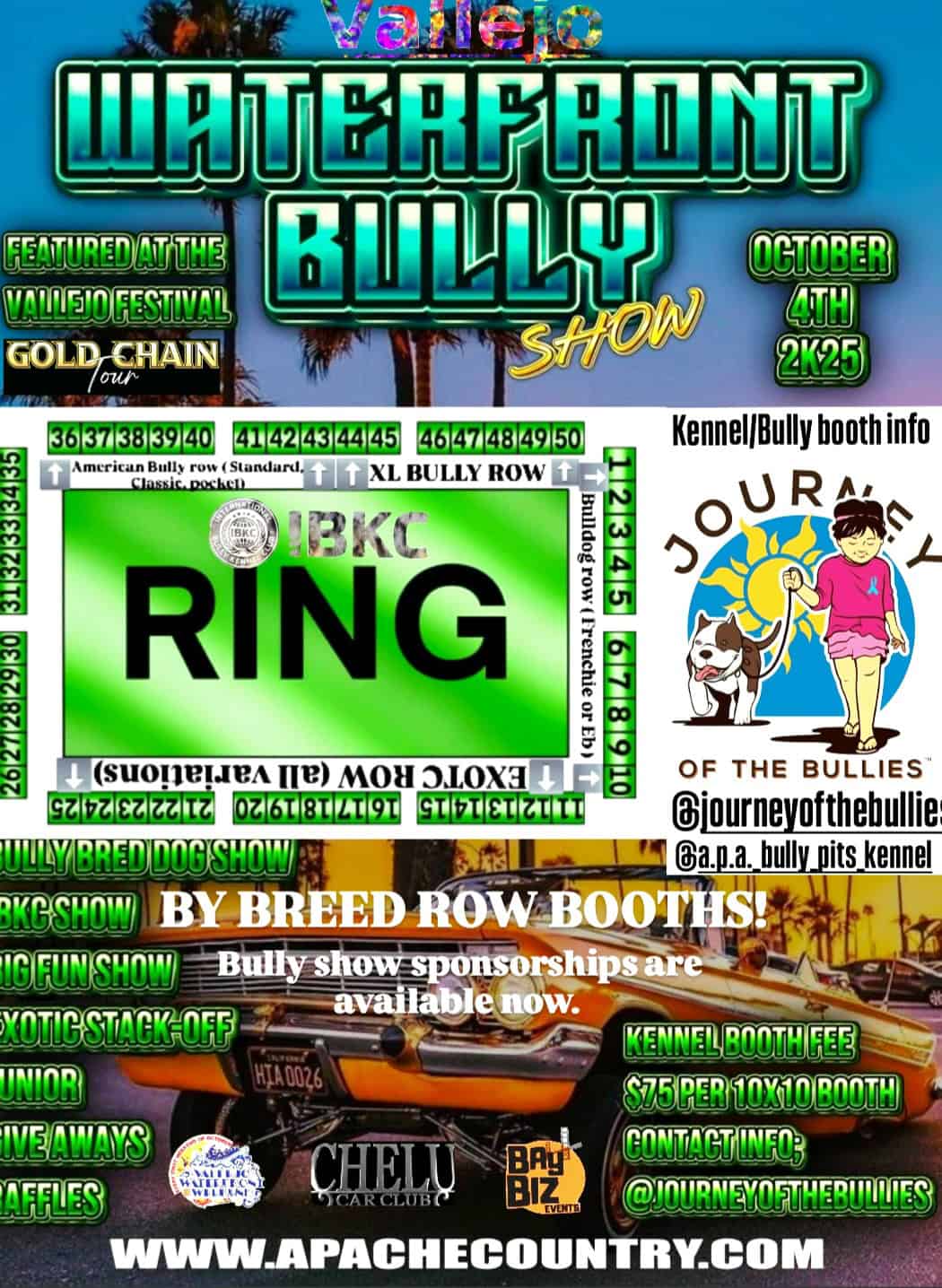 Waterfront Bully Show Organized by Journey of the Bullies Hosted by Apache Country & The International Bully Kennel Club. This special feature includes an official sanctioned Bully Dog Show, a Junior Handler Seminar for the kids that are just getting started or those who need to brush up on their show and breed knowledge. Also, a Fun Show Stack Off competition and #goldchaintour Best of the Best award. Participants will join this show from all over the bay area and California as far as Los Angeles. The pacific northwest may as well be in attendance traveling to Vallejo.